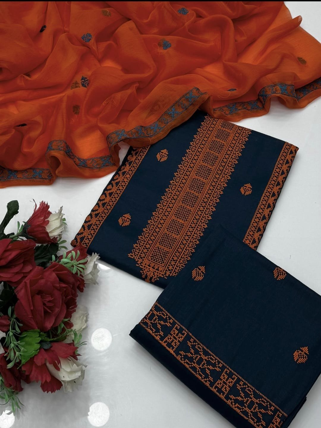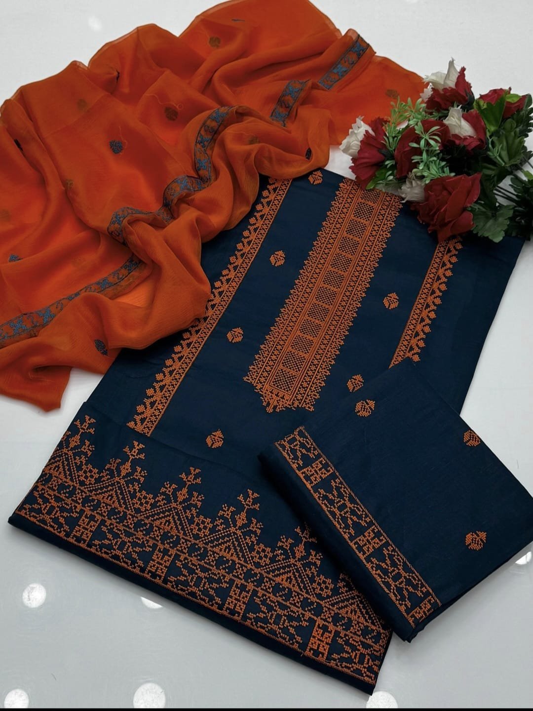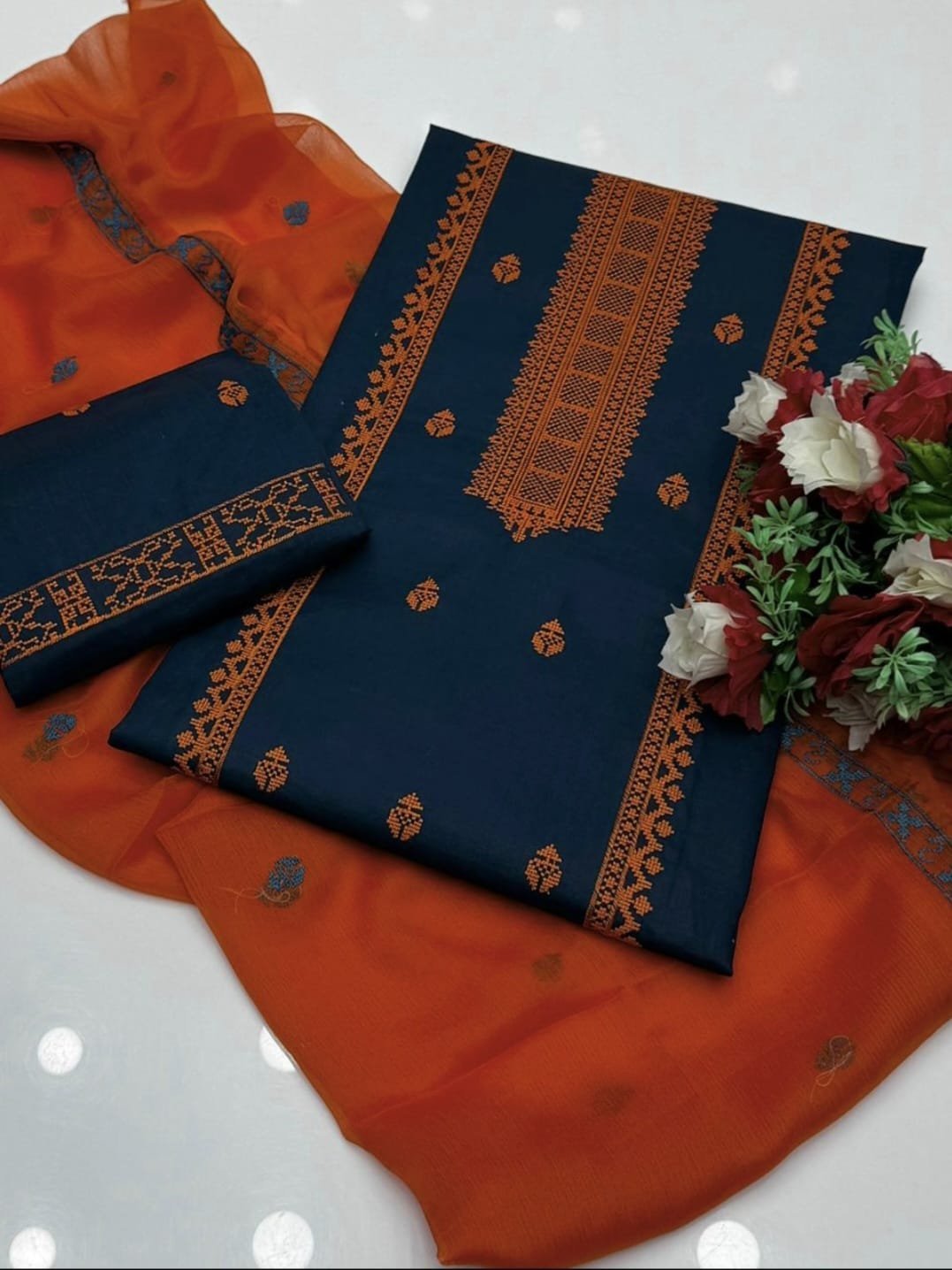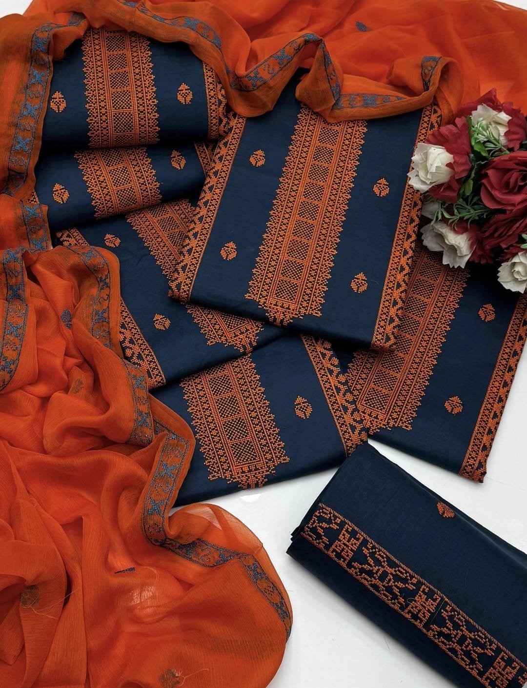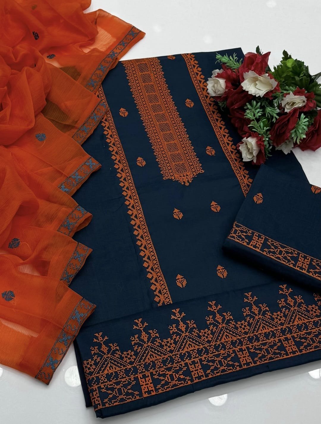 Cotton Cross Stitch Embroidered 3PC Suit with Chiffon Dupatta