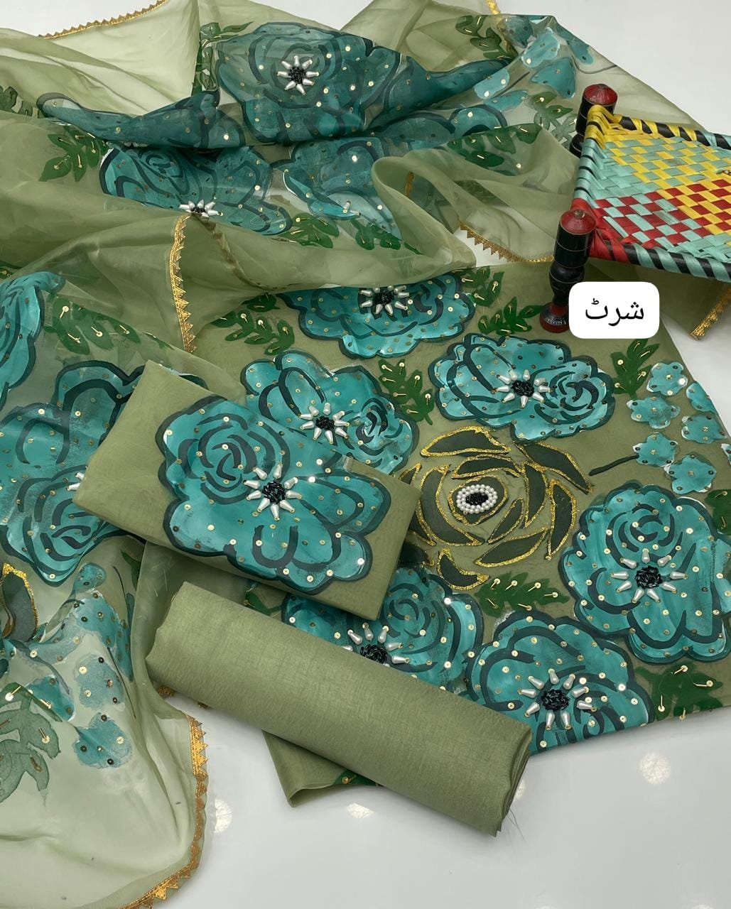 Handmade Oil Painted 3PC Organza Dress with Katan Silk Trouser