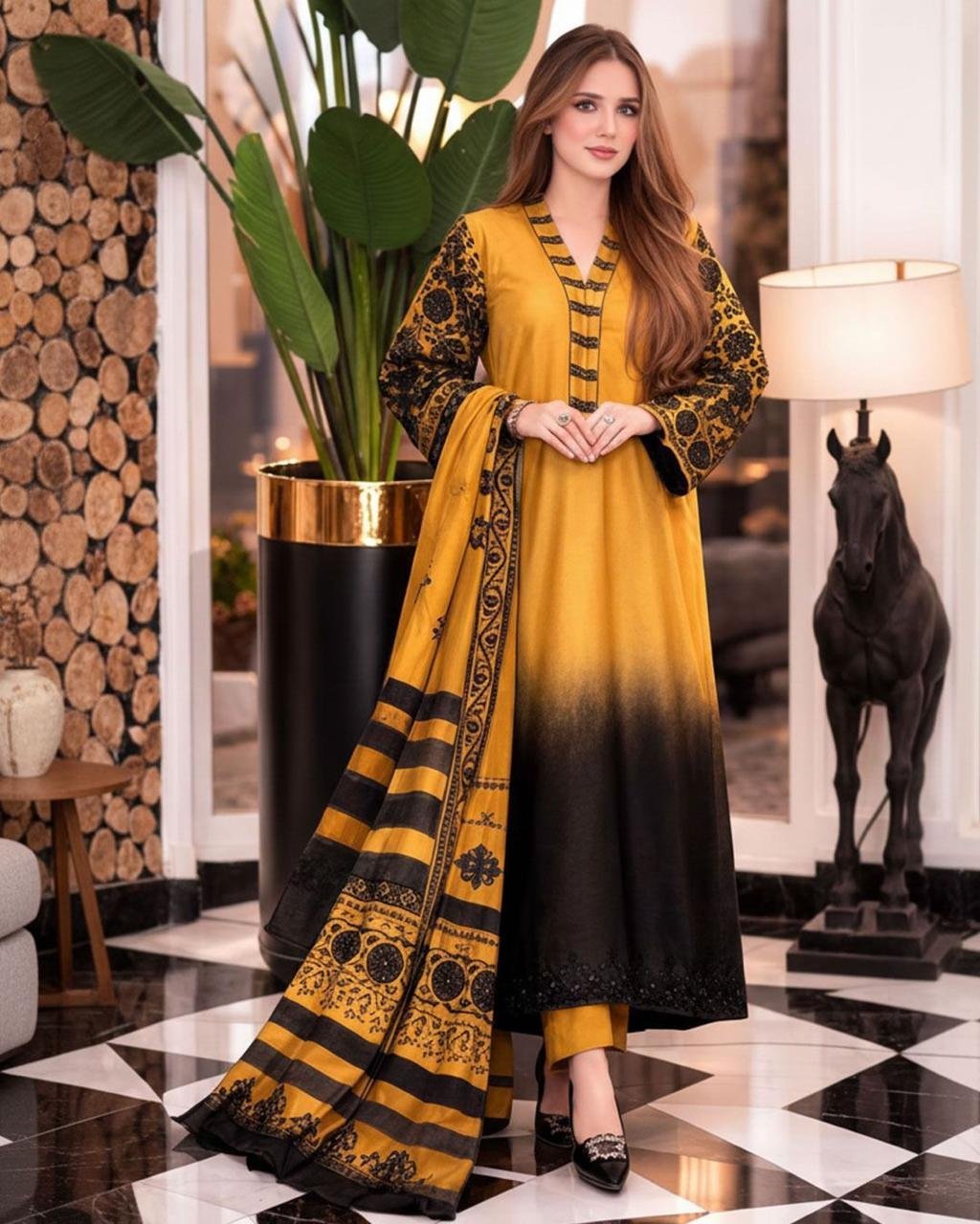 Be the first to review “Premium Shamoze Silk 3-Piece Suit with Handwork Neck & Digital Print Dupatta”