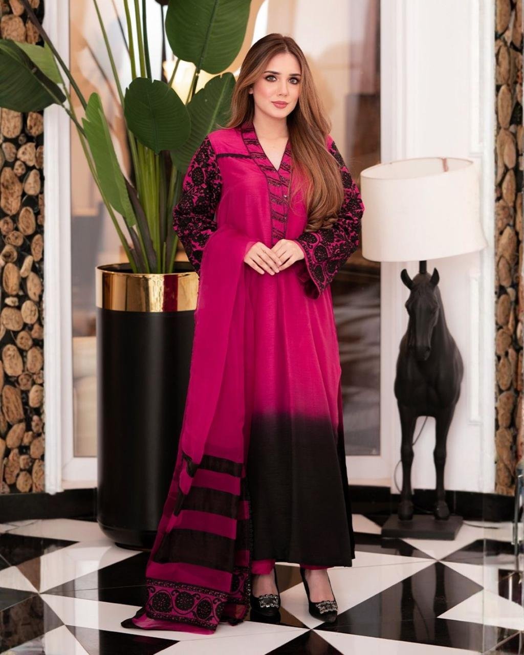 • Trendy Pakistani silk suit for women with a modern yet traditional touch