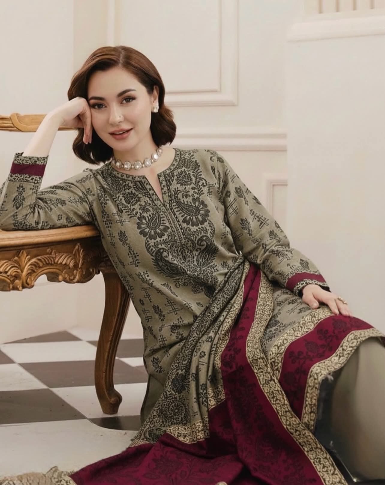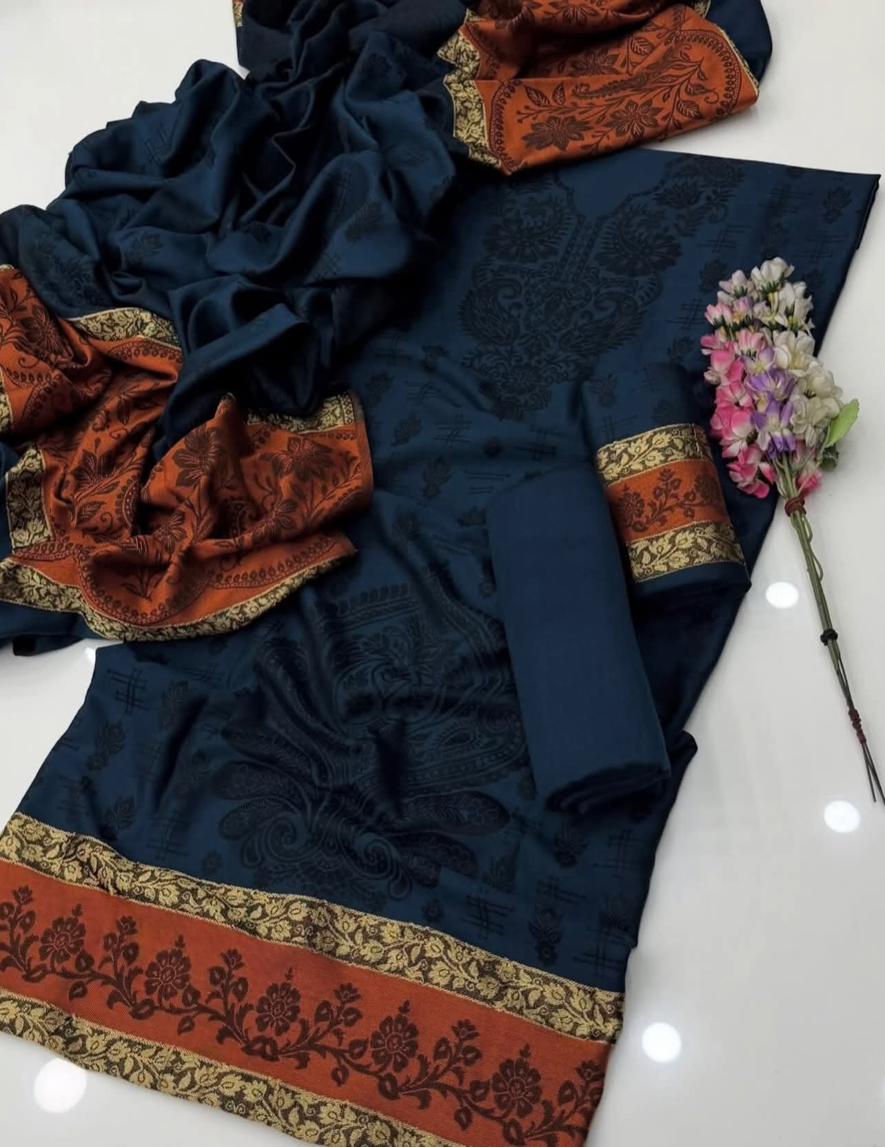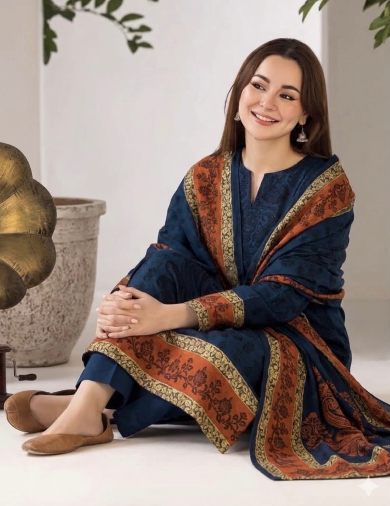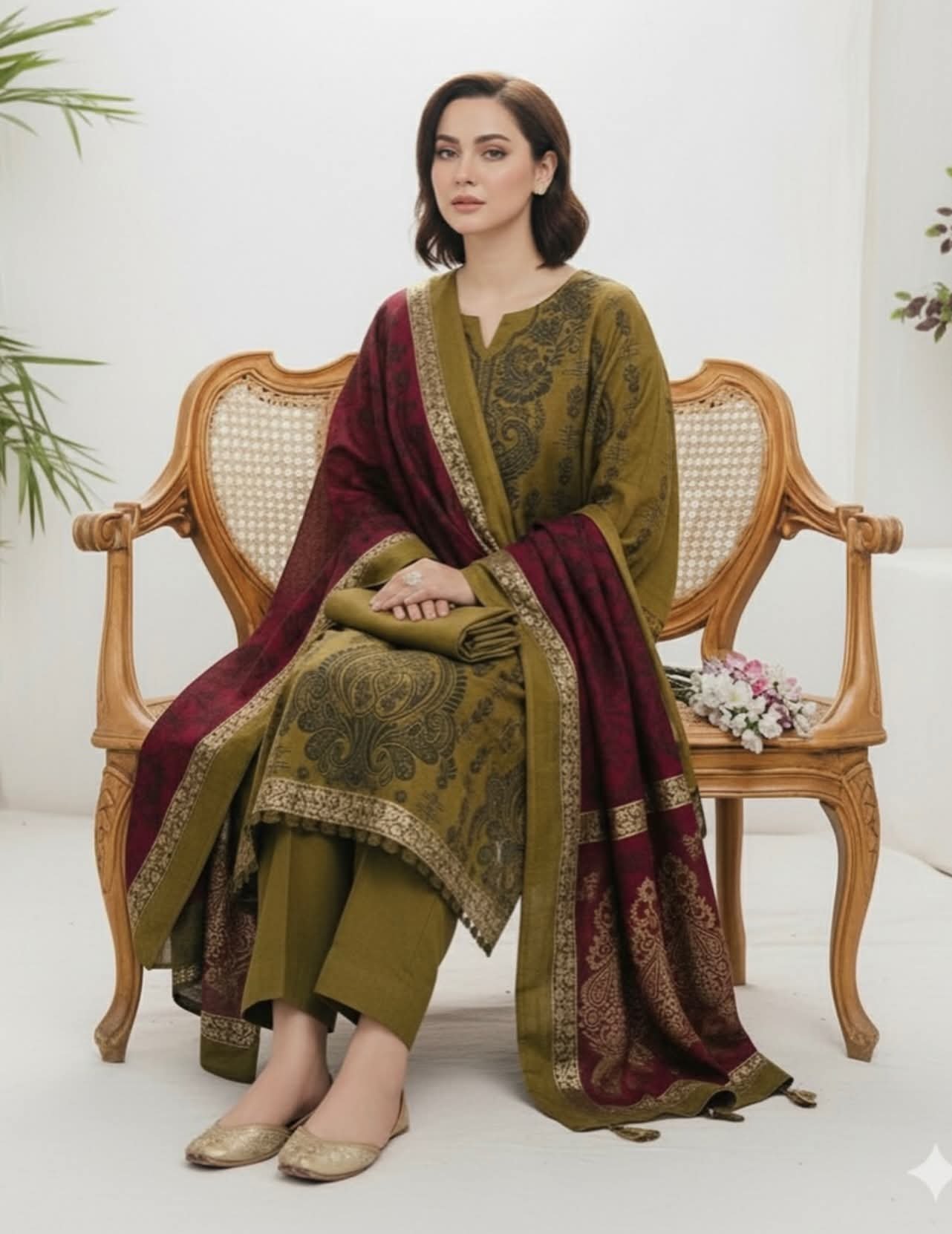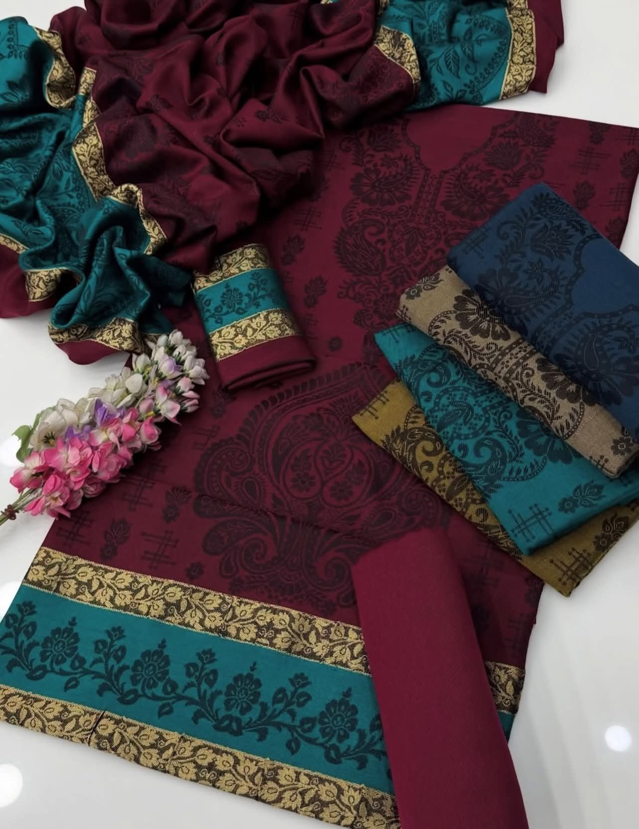 Stay warm in style with this premium Pure Pashmina Wool 5PC suit, featuring elegant Jacquard weaving on the shirt gala & daman, paired with a plain trouser, beautifully woven shawl, and separate sleeves. A perfect blend of luxury, warmth, and winter elegance.