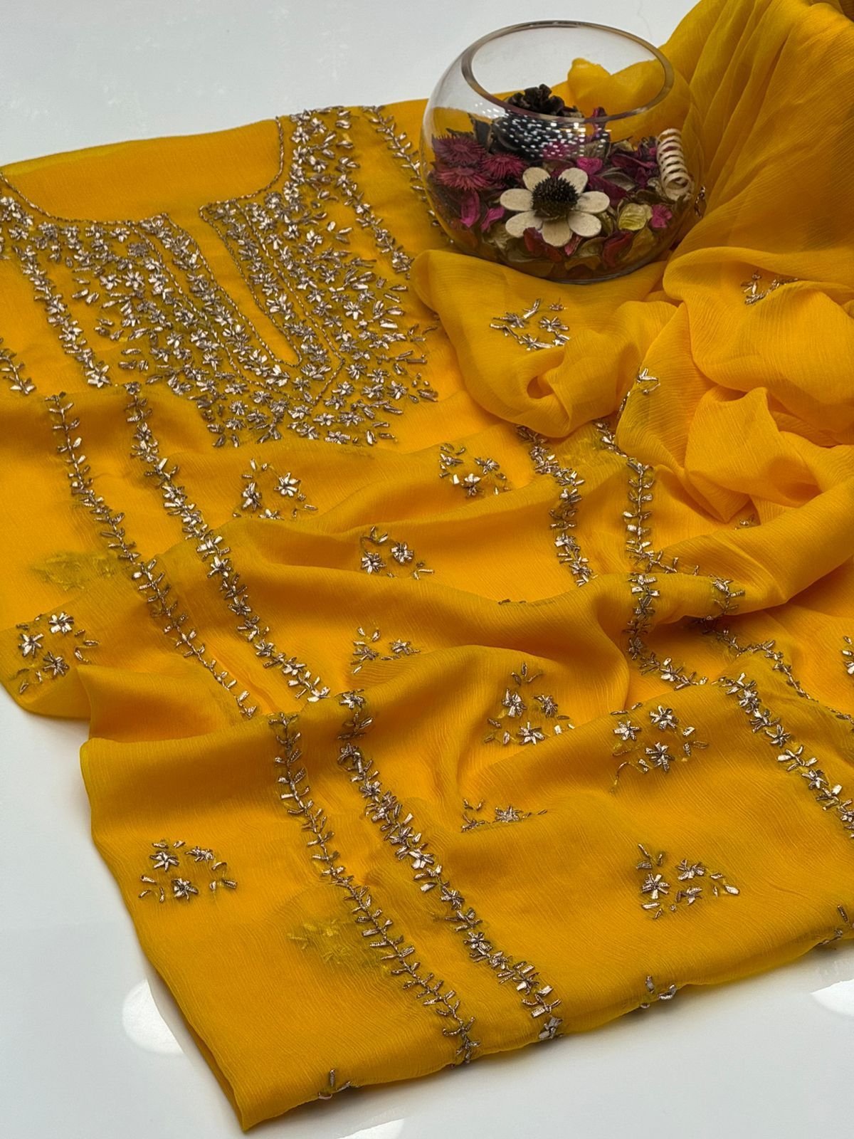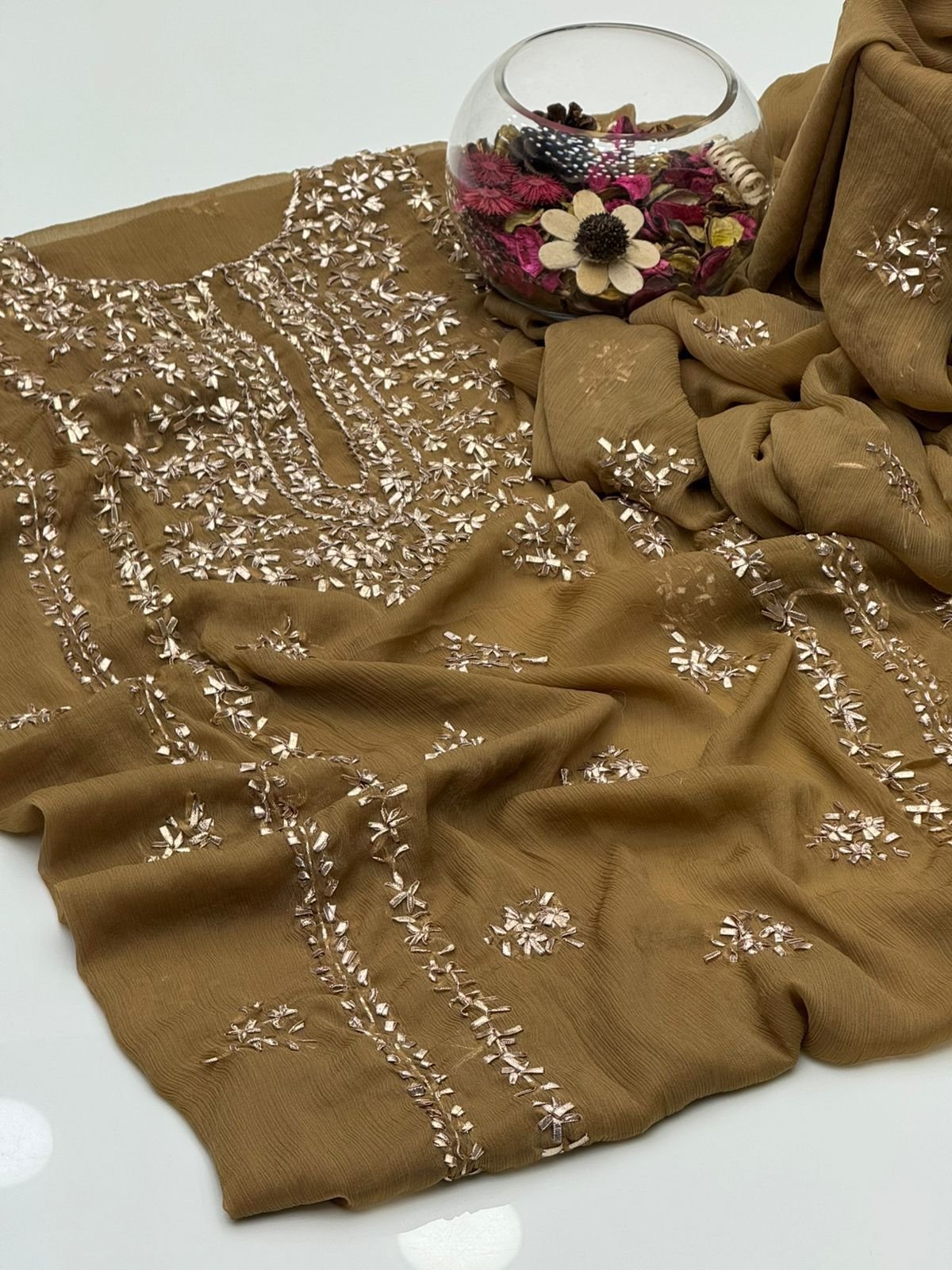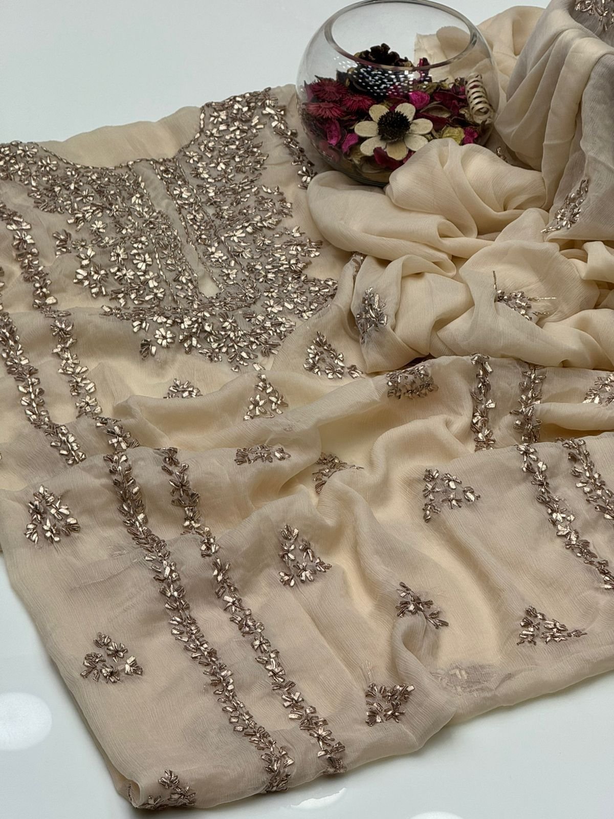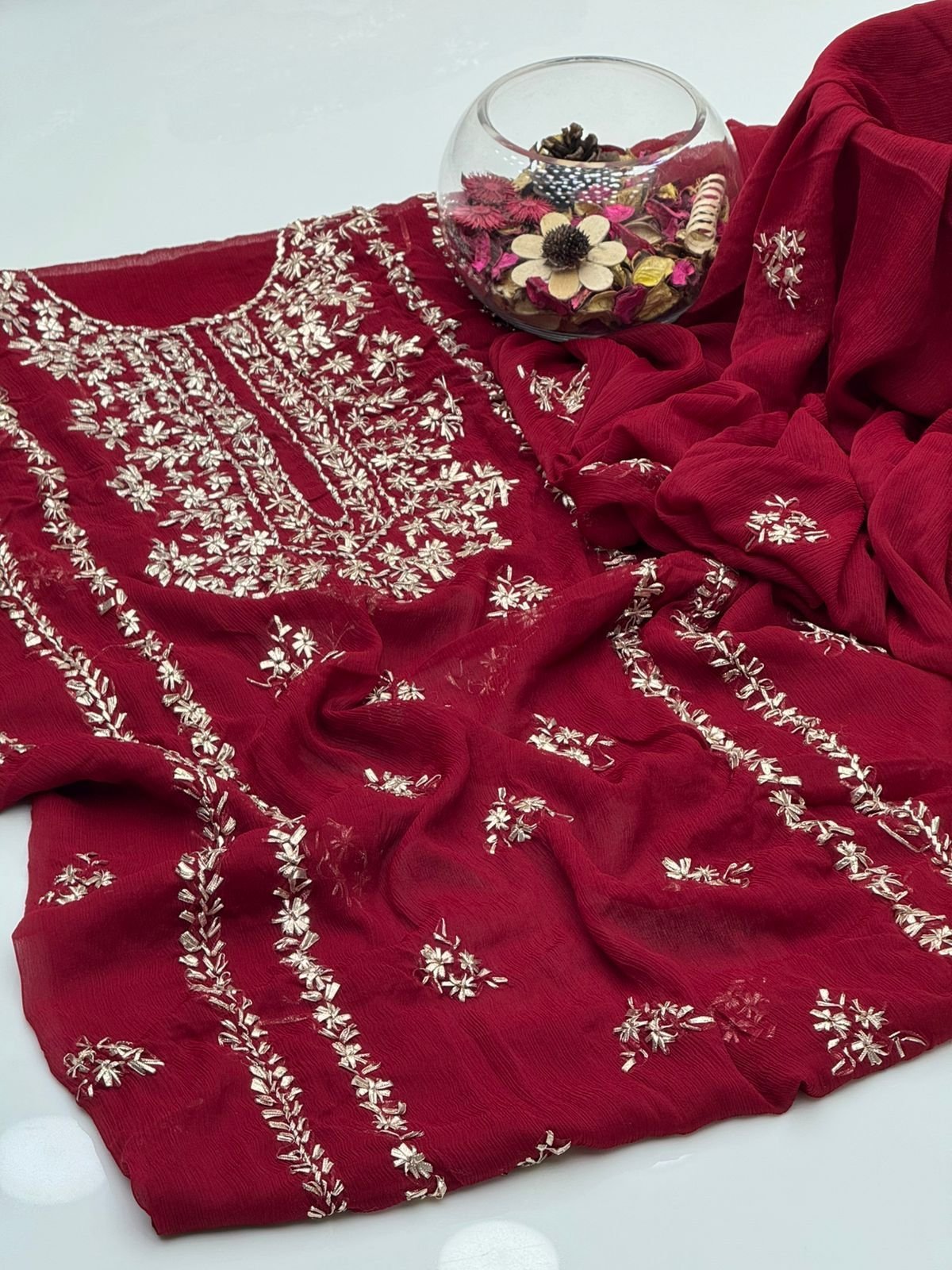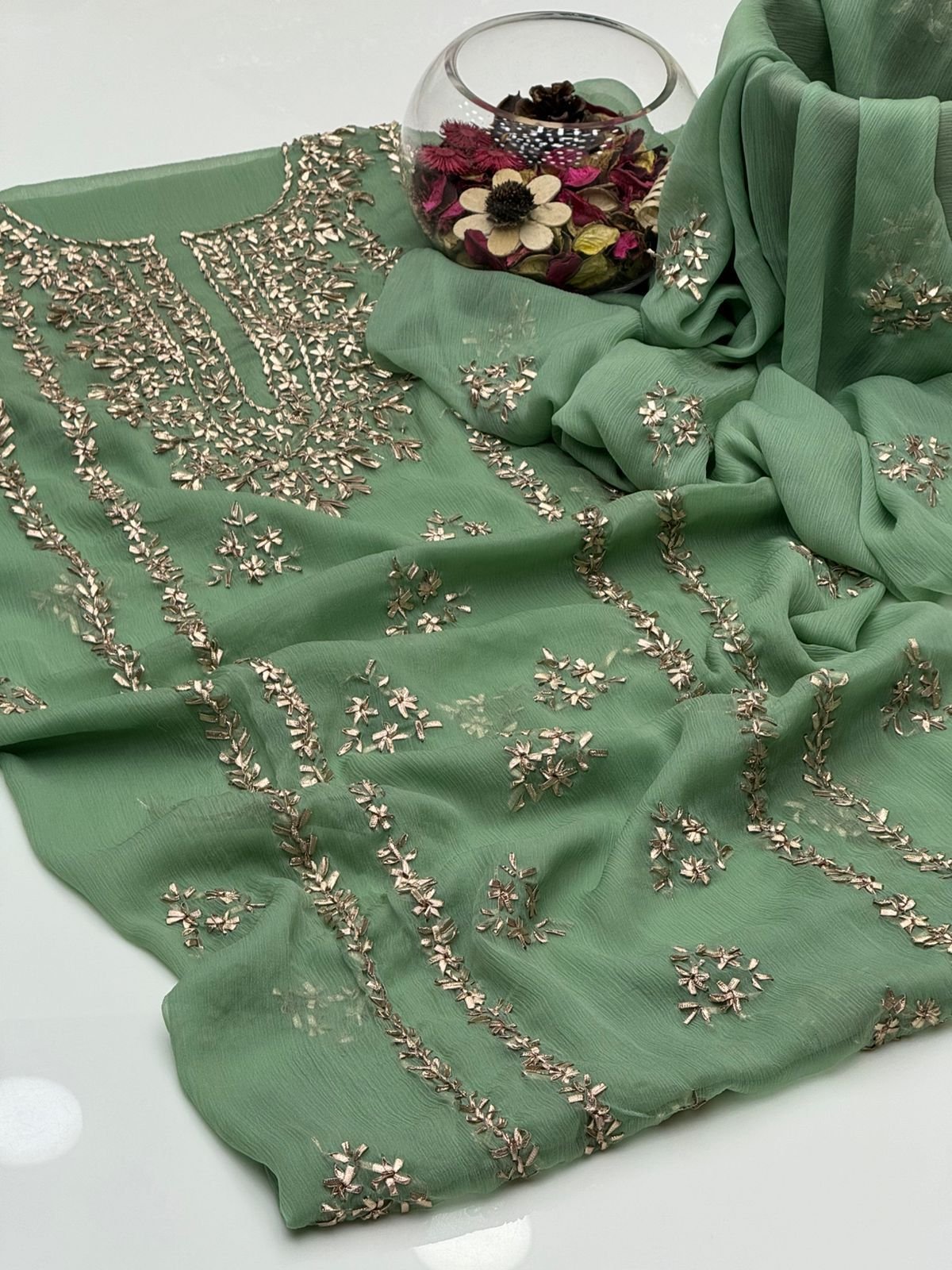 - Matching chiffon dupatta with gotta work for a graceful and festive look
