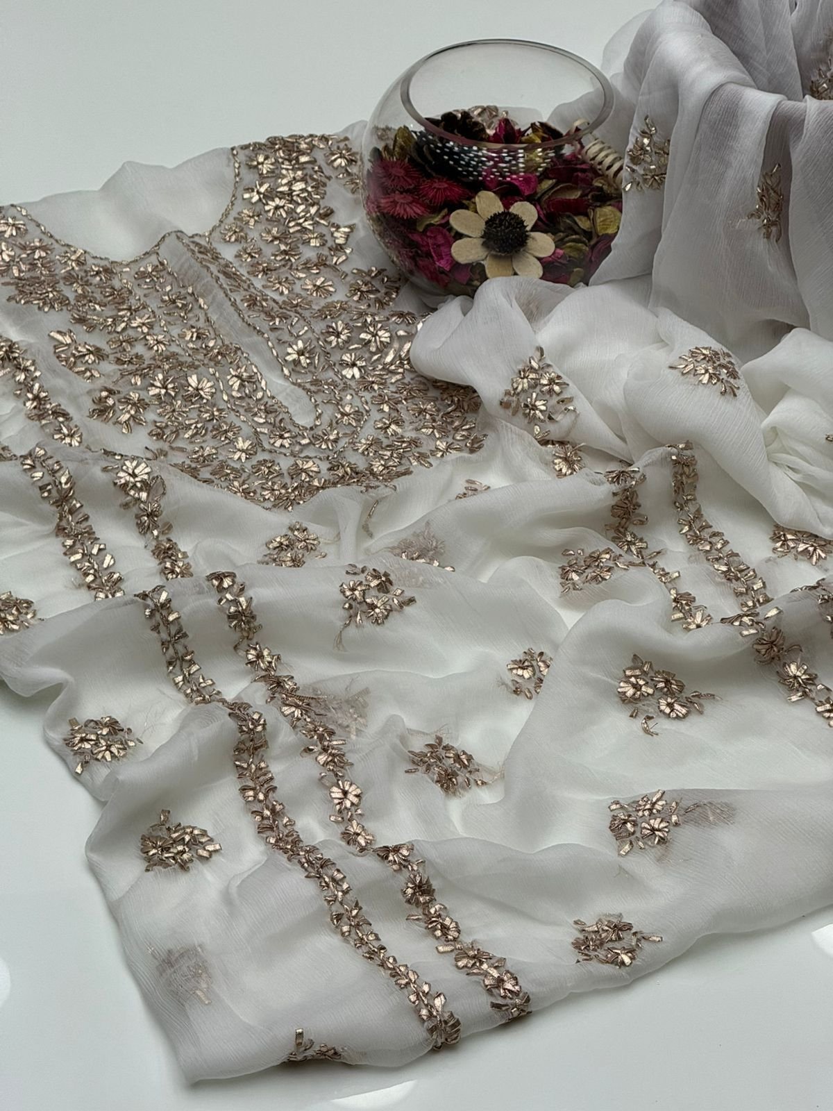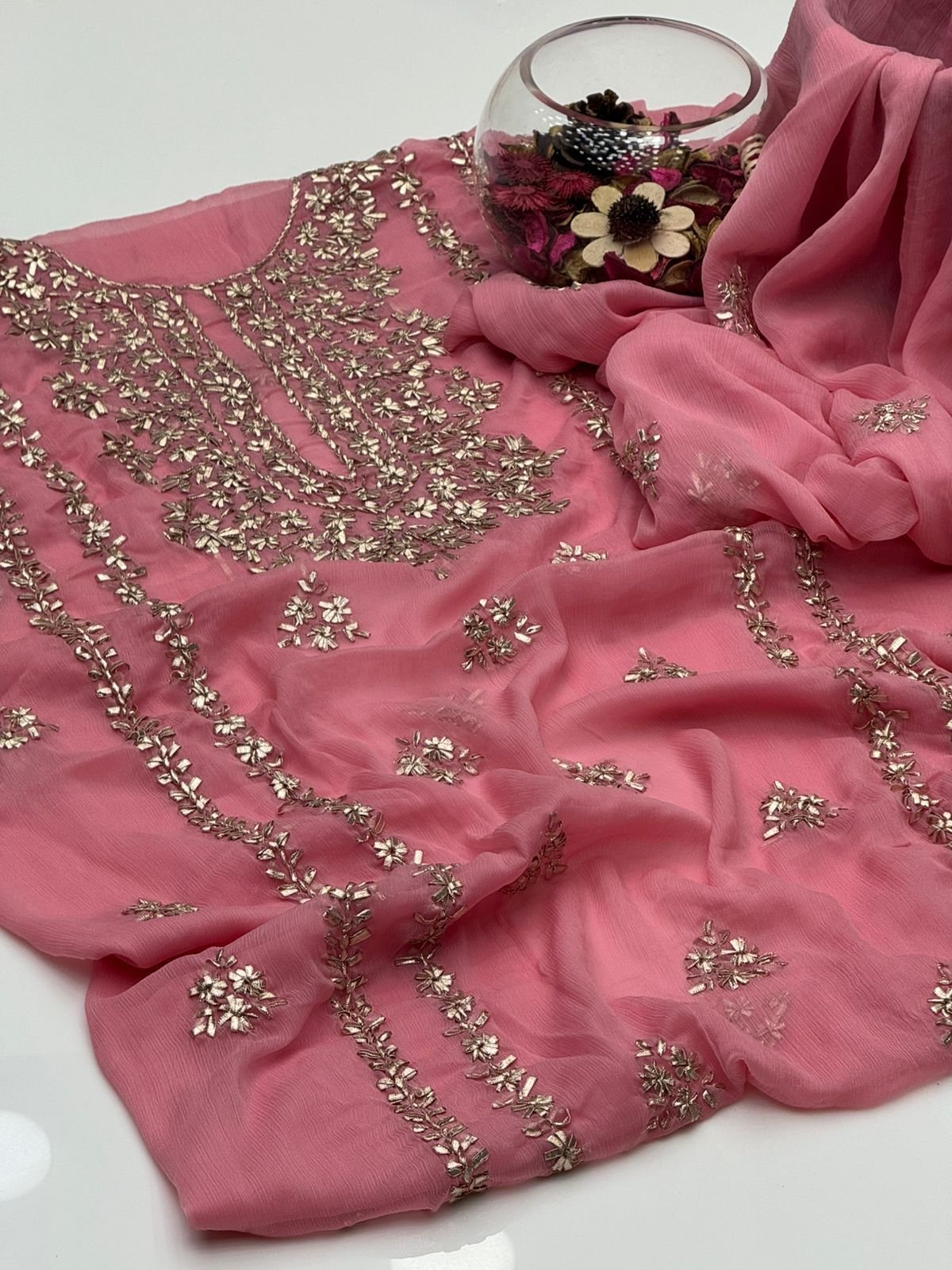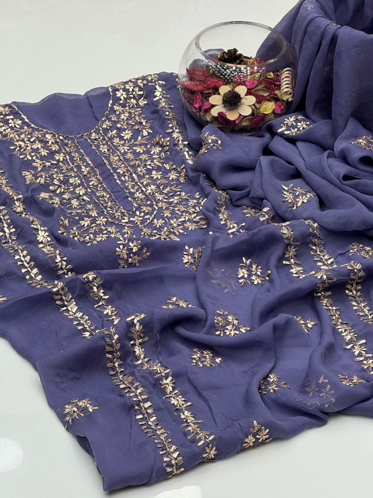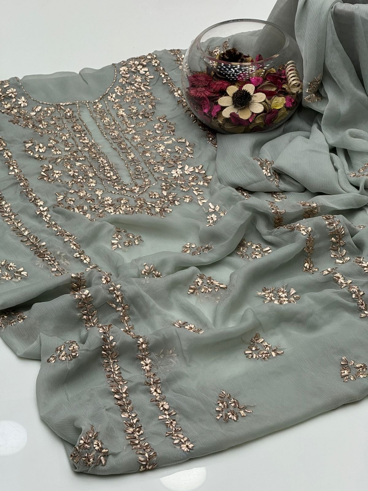- Matching chiffon dupatta with gotta work for a graceful and festive look