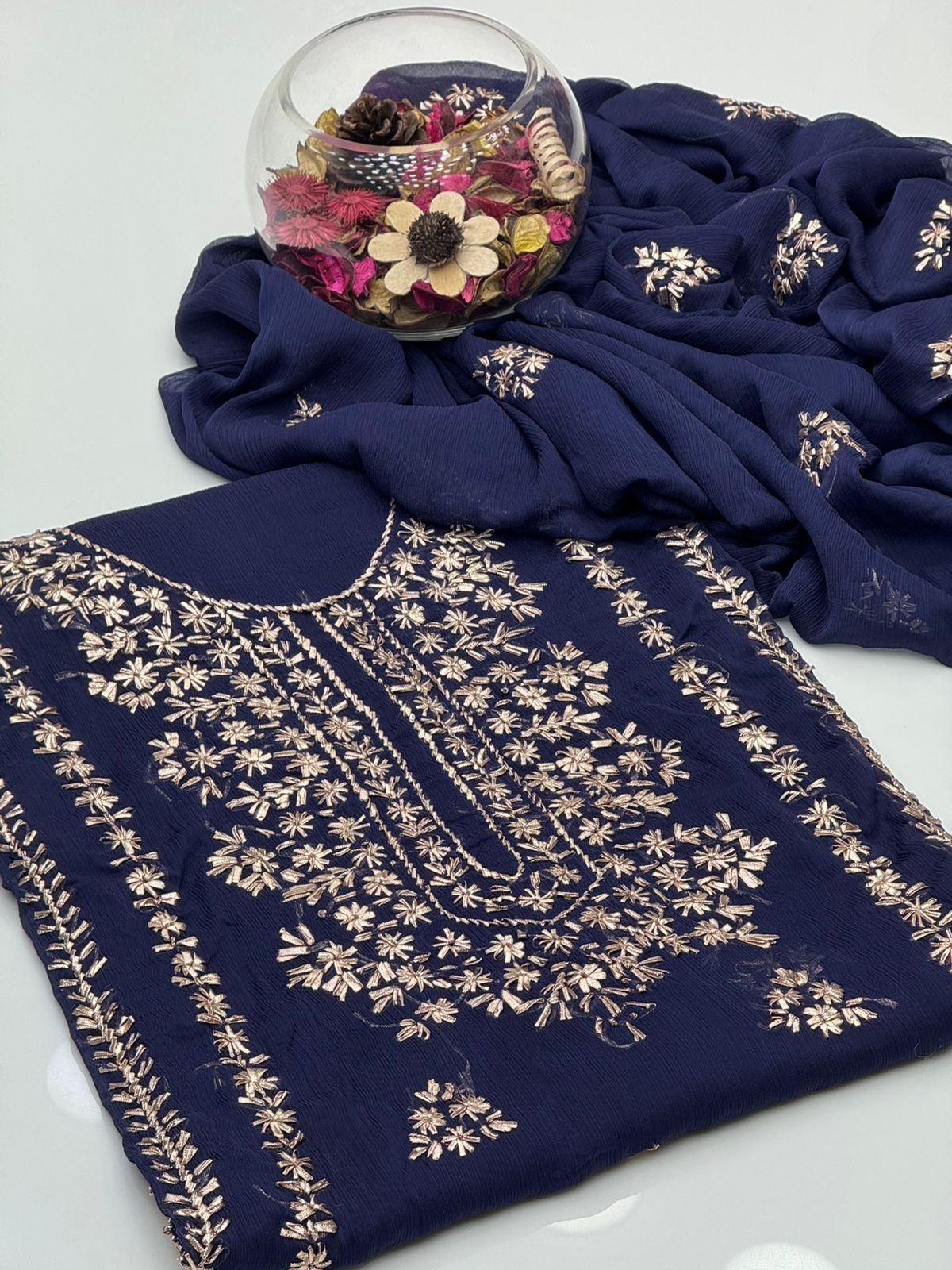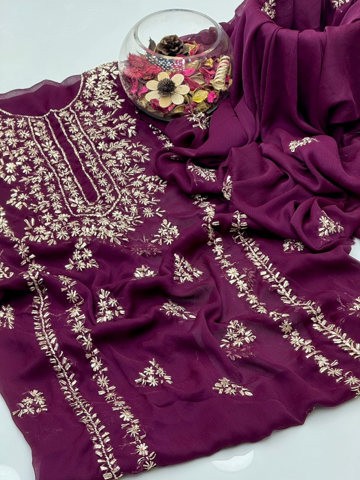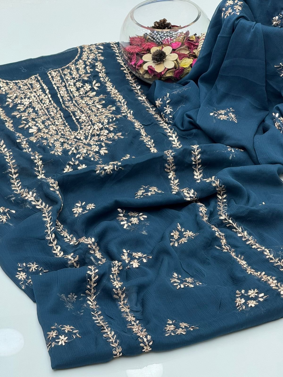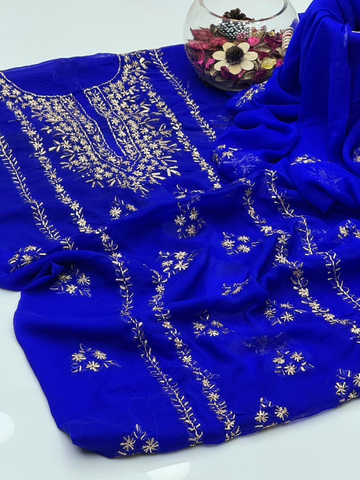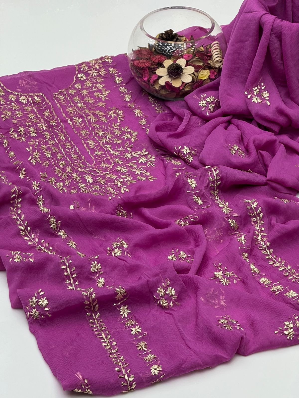 - Matching chiffon dupatta with gotta work for a graceful and festive look